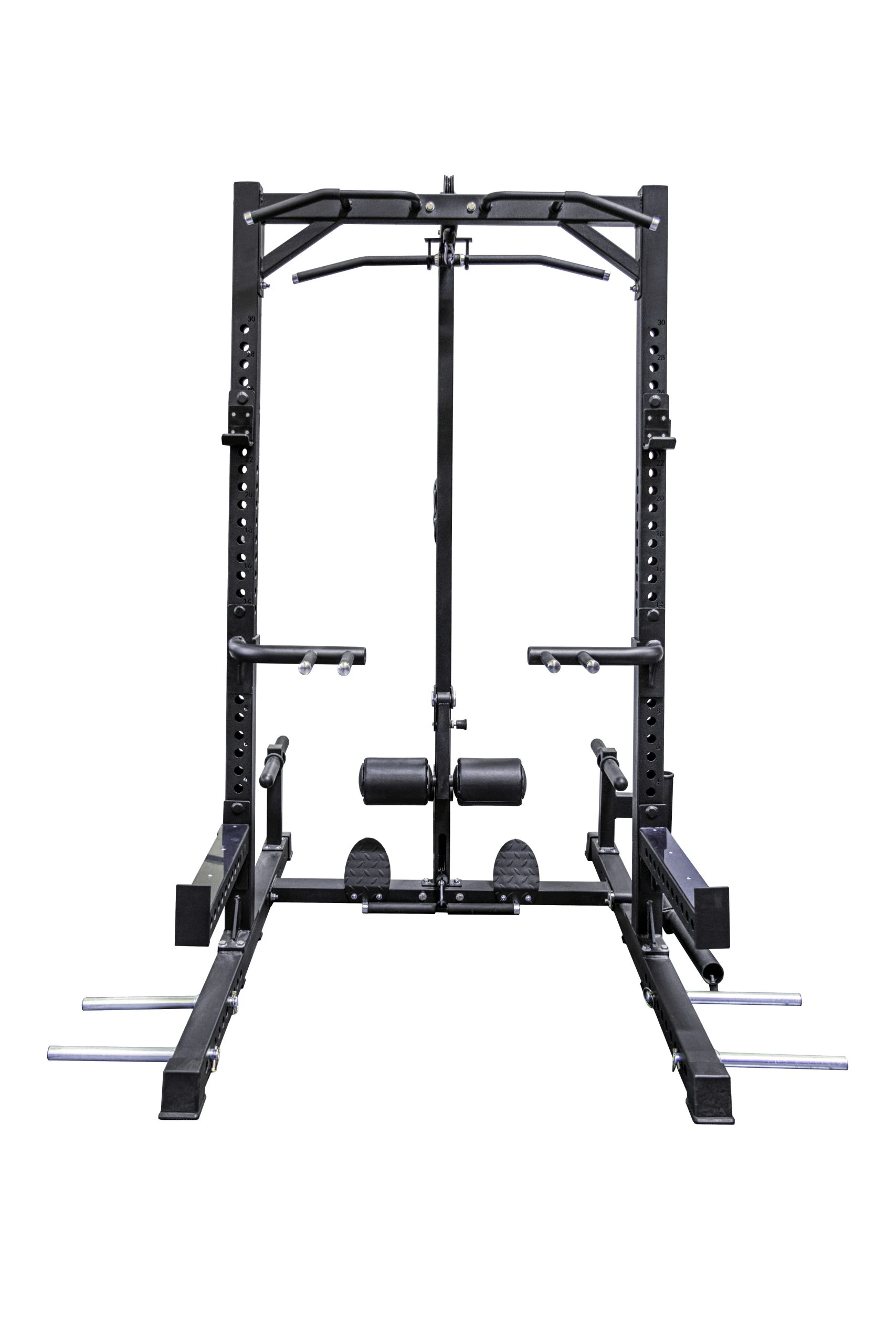 Unlike other basic half-rack units, the Legion HR3 Half-Rack includes a plate-loaded Lat Pull-Down with adjustable leg hold-down, Low Row cable with 2X fixed footplates for low row exercises, a multi-grip chin-up bar, dip attachment, landmine, band pegs, and storage for plates and bars. The ultimate garage or studio gym!