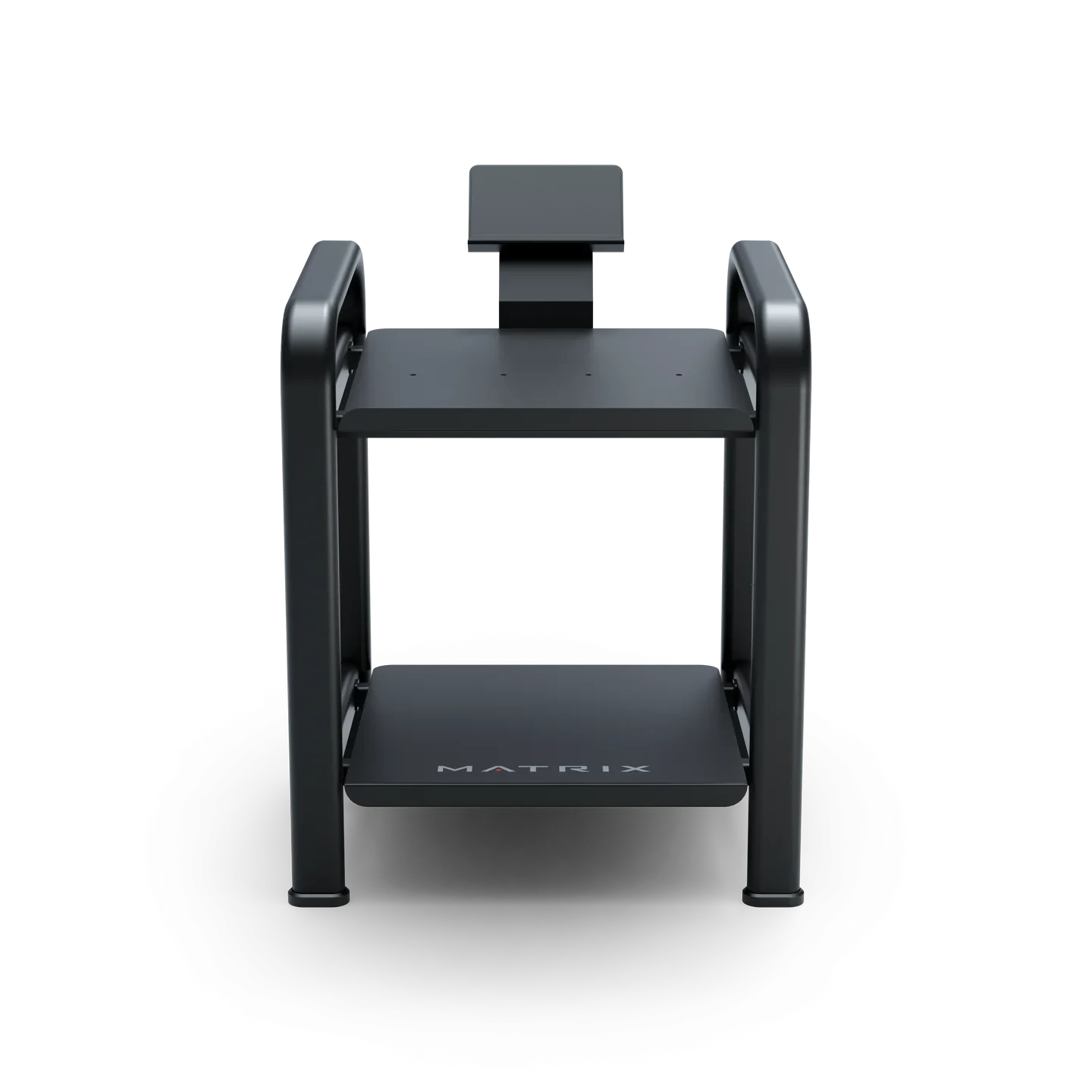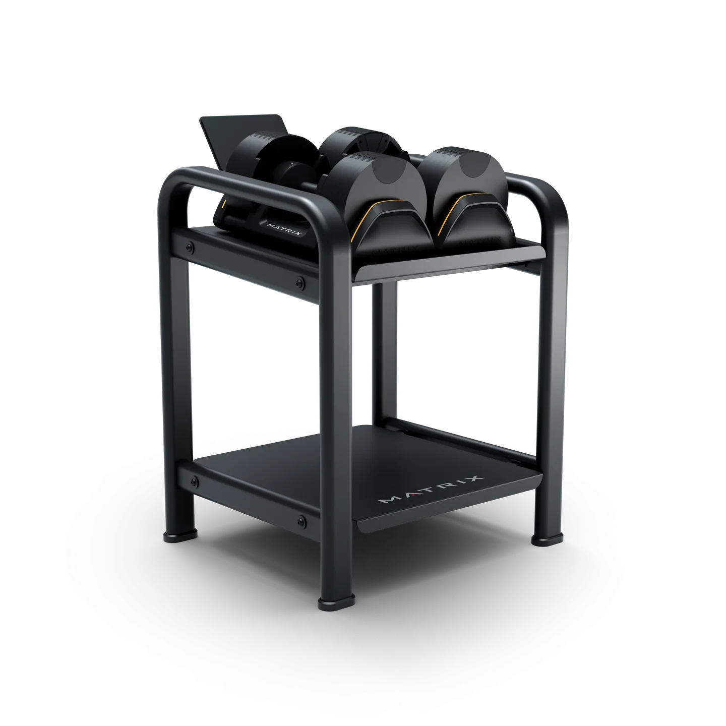 This optional storage rack elevates dumbbells for easy access and to reduce clutter. An integrated device holder makes it easy to keep workout programs and entertainment in view, while a lower storage shelf makes room for accessories like bands, mats and more.